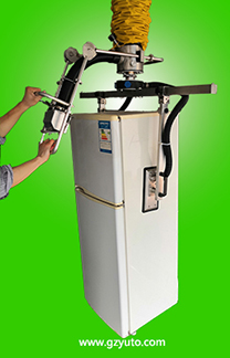 對于頂部強度不夠或者頂部有開口的物體,比如石英坩堝、冰箱和單缸洗衣機等產(chǎn)品, 傳統(tǒng)的從頂部用吸盤來吸附的搬運方式就沒有了用武之地。新型側(cè)吸式真空搬運機采用從兩側(cè)用吸盤來吸的方式, 成功地解決了這一搬運難題。