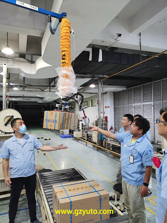 整套設備采用先進的VT120/3.0 Ext VacuErgolift 真空搬運機 和 折臂吊, 全部由廣州粵拓自己設計、生產(chǎn)和制造。此套設備已成功地在眾多客戶中被采用, 如廣能、廚邦、明治等, 并且出口香港海獅機械和香港CVI。
